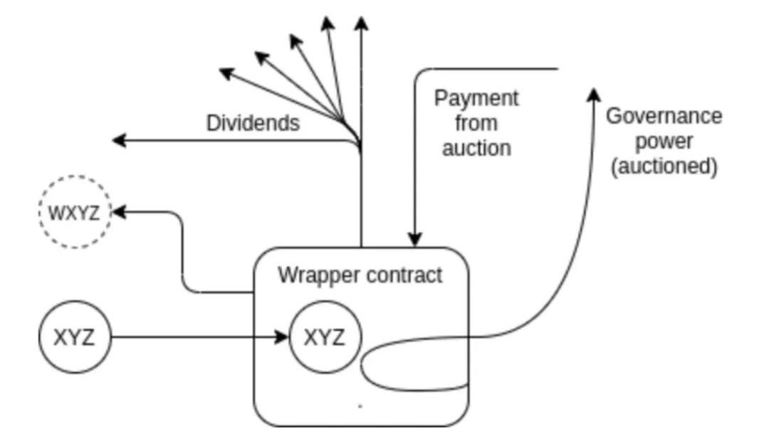 一旦確定試圖顛覆系統的攻擊者進入畫面,問題就會變得更糟。代幣投票的基本漏洞很容易理解。帶有代幣投票的協議中的代幣是組合成單一資產的兩種權利的捆綁:(i)協議收入中的某種經濟利益和(ii)參與治理的權利。這種組合是故意的:目標是使權力和責任保持一致。但實際上,這兩種權利很容易相互分離。想象一個簡單的包裝合約,它有這些規則:如果你將1XYZ存入合約,你會得到1WXYZ。WXYZ可以隨時轉換回XYZ,此外它還可以累積紅利。紅利從何而來?好吧,雖然XYZ代幣在封裝合約中,但封裝合約可以在治理中隨意使用它們。封裝合約只是簡單地每天拍賣這個權利,并將利潤分配給原始存款人。