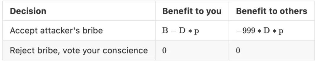 如果,您傾向于接受賄賂,但只要,接受賄賂對集體有害。因此,如果,攻擊者有機會賄賂用戶采取凈負面決策,對每個用戶的補償遠低于他們所遭受的傷害。