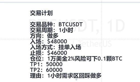 第五步確定入場方式常見的入場方式有3種,分別是掛單入場、突破入場、確認入場,下面簡單介紹l掛單入場:當價格第一次來到該價格時,訂單立刻成交l突破入場:做多舉例,當價格自下往上運行至改價格,訂單立馬市價成交l確認入場:當價格來到該價位時,等待交易信號我們以掛單入場來舉例說明,RT,我在BTC掛了46000買入做多的交易單,入場方式為掛單入場,當價格由48000下跌到46000時,我的訂單就成交了,確定好入場方式,這一步就完成了1、打開記事本或者隨便能記錄文字的軟件,以TradingView空白區域舉例輸入格式:“入場方式:掛單入場”