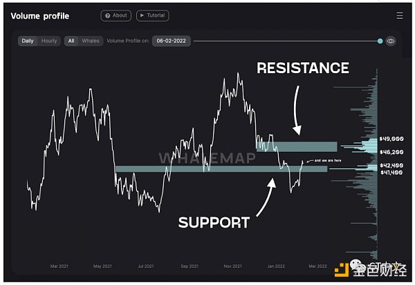 與此同時,來自Whalemap的鏈上數據跟蹤計劃預計,比特幣的“當前阻力區間”為46200美元至49,000美元,理由是過去這個價格區域內的交易活動較高。