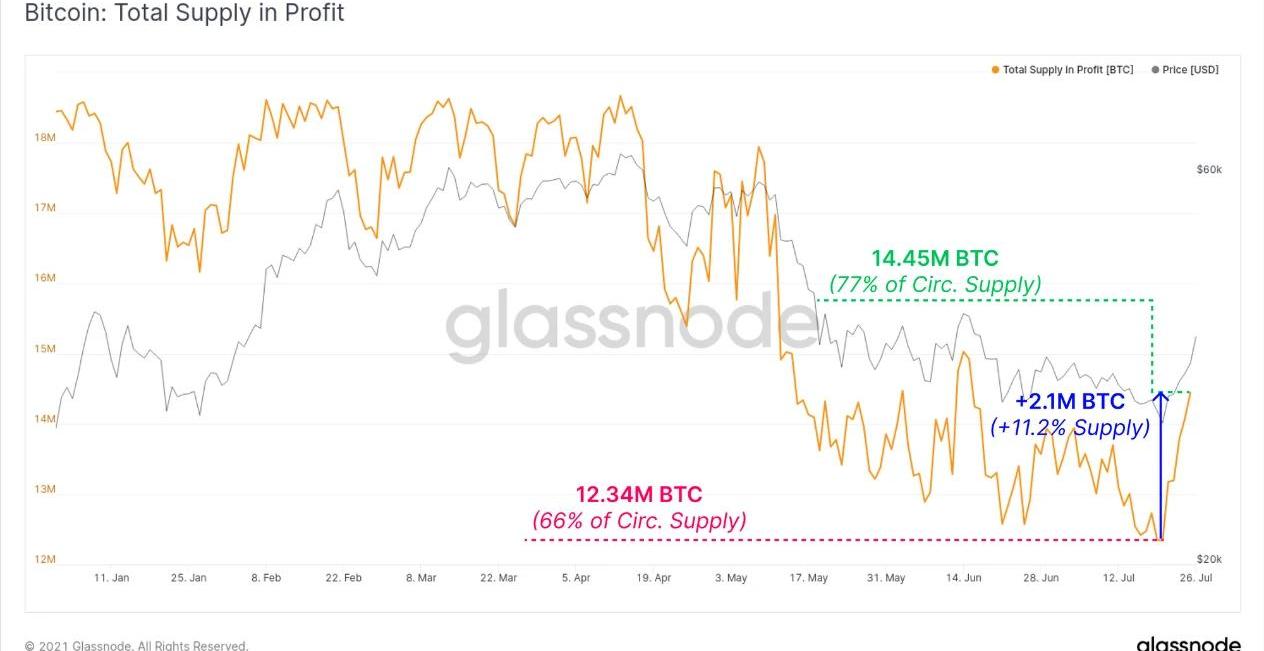 此次反彈之前,鏈上有1234萬枚BTC處于盈利狀態,反彈之后,處于盈利狀態的BTC增加到了1445萬枚。本次反彈使210萬枚BTC恢復了盈利狀態。