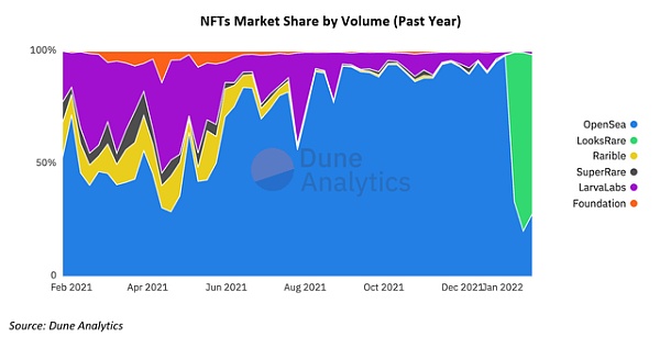 OpenSea 擁有最大的市場份額,直到LooksRare (LOOKS-USD)于 1 月 10日推出“吸血鬼攻擊”。