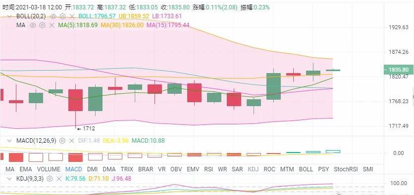 4小時走勢圖看,布林帶整軌下行呈縮口狀態,布林上軌向下運行,目前行情突破各均線壓制在布林中軌上方向上移動,MA5均線拐頭向上在行情下方形成支撐,附圖指標,KDJ三線均值在70上方形成金叉向上運行。MACD快慢線在0軸值的上方平行運行,多頭能量柱在持續放量。短周期小時圖來看,布林帶整軌拐頭向上呈喇叭狀,MA5均線向上在幣價下方形成支撐,其余各均線拐頭向上,目前行情在布林中軌的上方震蕩,上方布林上軌1850美元附近有壓制,附圖指標,KDJ三線平行交叉粘合向上,DIF即將穿過0軸向上運行,帶動MACD多頭由縮量轉化為增量。綜合來看居士認為短線多頭的小幅回調是在積蓄動能,而布林帶上軌的壓制日內有望突破,日內操作思路低多,回調支撐位附近做多。