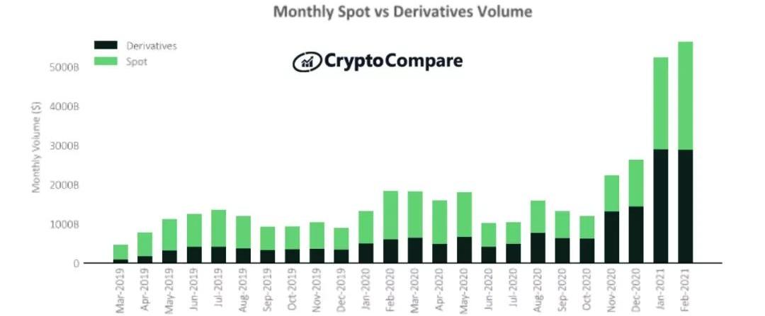 例如,上圖所示,2020年12月份,衍生品市場占加密市場總份額的54.8%,2021年1月份,增長至55.3%,而2月份,現貨交易量大增,衍生品市場縮減至加密貨幣市場的51.3%。而較為戲謔的是,在半年前,衍生品市場還只占加密貨幣市場的3分之一。