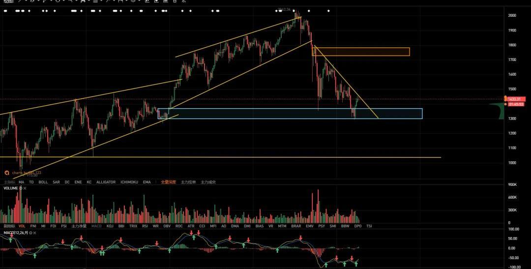 以太坊連動于比特幣,但走勢更弱,相對比特幣匯率已從高點0.046下降至0.03,跌幅達35%。如圖所示,以太坊同樣于昨日凌晨創出調整低點,并剛好于上期報告中所畫支撐區下沿1300附近止跌,當前反彈至下壓趨勢線,后續關注比特幣走向;下方仍然關注1000附近強支撐位。