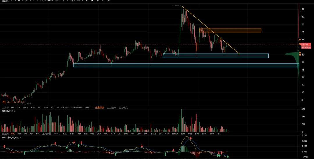 如圖所示,UNI收斂級別不斷擴大,波動率與比特幣相似不斷降低,然而不同的是,比特幣創出調整低點的同時UNI并未創新低,且于上期報告中第一檔支撐區上沿20附近止跌,在主流幣中表現尤為強勢。當前UNI同樣反彈至下跌趨勢線處,后續關注能否有效突破;下方有效支撐仍然關注圖中最下方藍色矩形區間16.6-17.7。