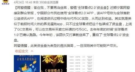 幣圈流行這么一句話:韭菜的記憶只有七秒。果不其然,到了2020年2月,同樣的配方熟悉的味道,操盤手重啟了一個新項目,全球看點2.0,依然是通過閱讀獲得收益。投資人們卻忘記了曾今的痛,又沖進去了。但這一次卻驚動了,宣城網警直接在微博里喊話:答應我,不要再當韭菜,警惕“全球看點2.0”資金盤。
