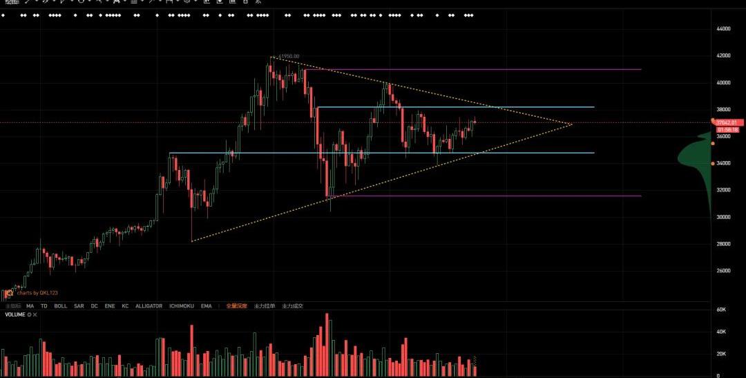 如圖所示,比特幣目前形成一個為期近20日的大級別收斂結構,在機構內部波動率不斷下降,其ATR達到兩周內最低水平,或將近期迎來大行情,重點關注收斂結構突破方向。比特幣短期支撐和壓力分別為34800和38200附近,中期支撐和壓力關注31580和41000一線。