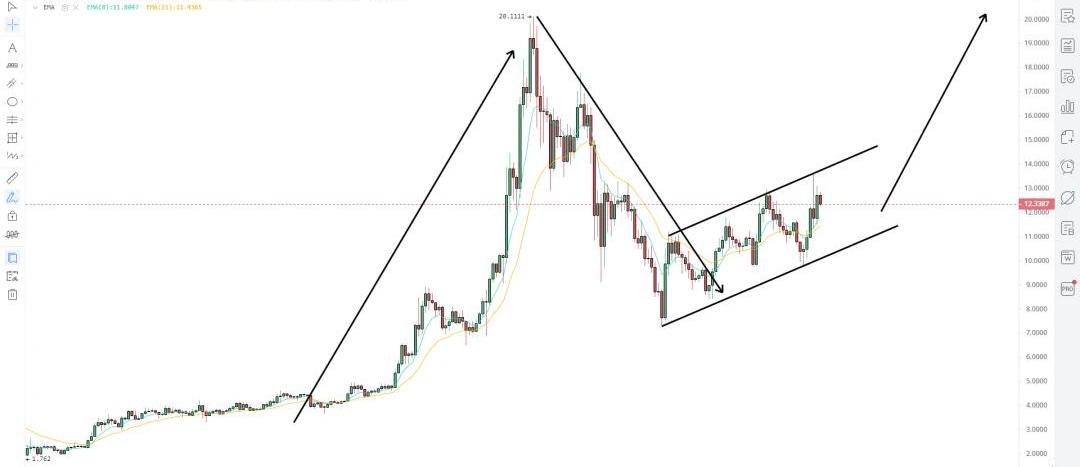 LINK完成前半年上漲后的價值修正回調行情,目前在走上行通道,多頭是主要關注思路,關注回踩支撐的做多交易機會,關鍵支撐11.92