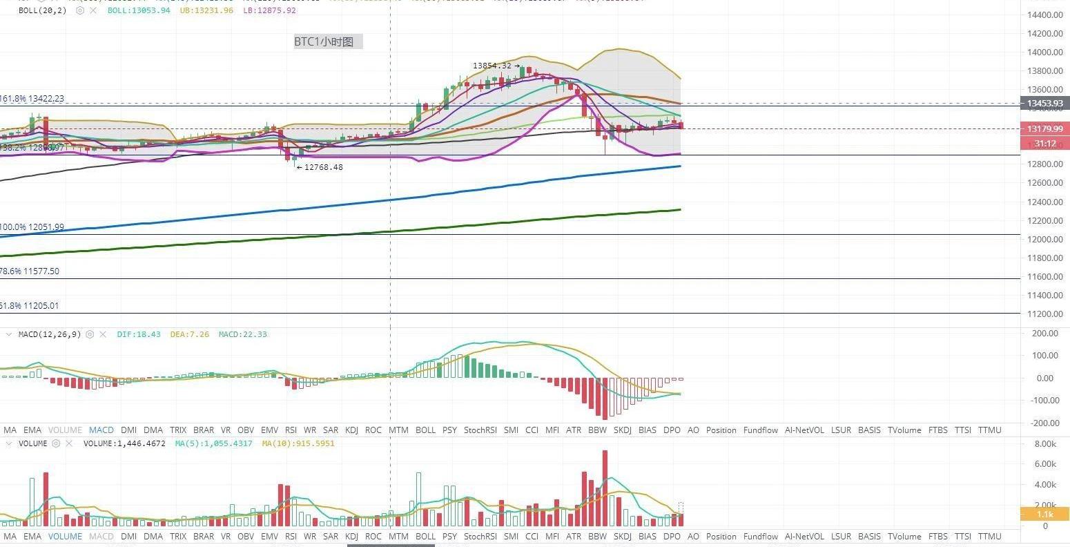 短周期1小時圖中,經過昨日瀑布,布林帶再度打開,今日凌晨至目前,行情還是屬于區間盤整期間,上方短期壓制位在13327一線,其次13422一線。今日區間盤整后看反彈,如果行情不能企穩13422上方,行情會再度回落。可結合以太坊行情進行具體分析,以太坊行情在下一篇。