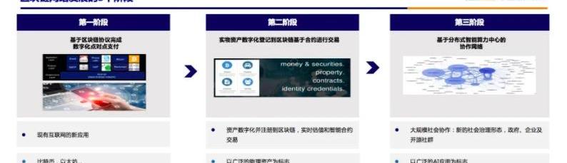 基于這樣的認知,我們也可以看到區塊鏈的三個發展階段。到現在完成了第一個階段,我們利用互聯網認證了模型,它可以做更好的應用,可以把數字化搬上來完成支付。第二階段是如何來到老百姓身邊,如何利用區塊鏈改變我們的生產和生活,那就是我們需要把現在的資產帶到區塊鏈上,未來我們認為區塊鏈是大規模的智能計算協作網絡,可以面向整個社會治理模式發揮作用。