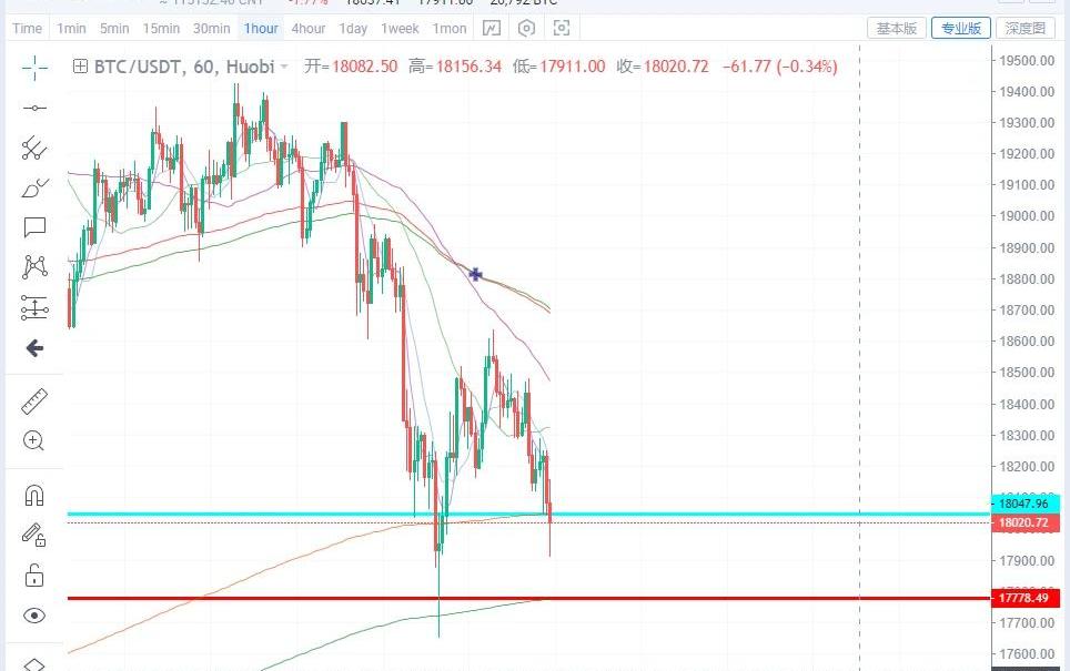 比特幣整體上在昨日走出'v‘型反轉后,行情停漲回調,在最低回探18150一線后,行情震蕩反彈,我們給出策略后,于今日凌晨時分激活空單建議,整體上目前最低點位18000一線附近,成功達到我們的空單第一止盈目標,而對于目前的行情來看,行情經過反彈震蕩積蓄空頭勢能繼續下探,而就從市場面上來看,行情整體上處于弱勢之中,那么我們后續的操作上就要以空頭為主,整體上今日操作上建議大家依托18300-18500為上方壓制位去布局空單,下方17800-18000為支撐去布局多單,行情跌破小時圖及四小時圖級別vegas隧道雙通道重合其區域17800-18000建議暫時放棄多單思路。