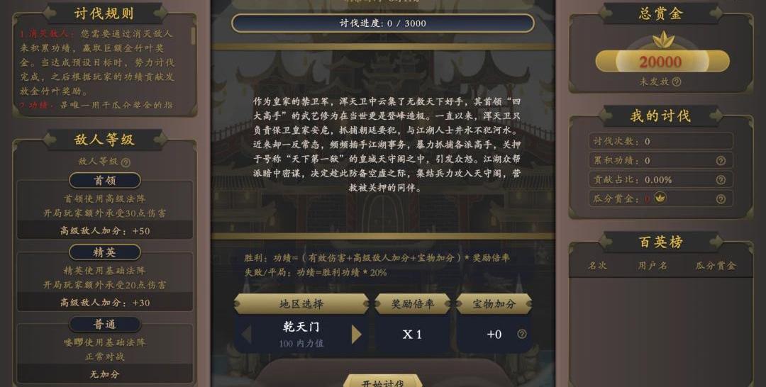 在開始討伐前,您可以選擇前往的地區,越是深入敵方核心,消耗的內力越多,同時獲取的功績也會成倍增加。所有玩家在中投入的內力,都會轉化為金竹葉投放到獎池中,在討伐任務中英勇過人,功績卓著的俠客,將能獲得巨額的金竹葉賞金。