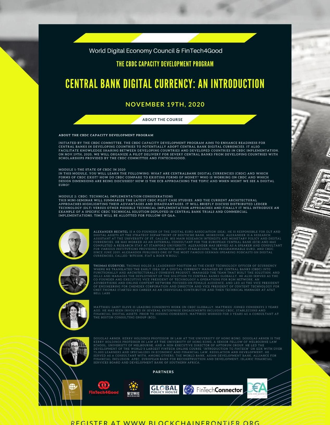 為了促進知識普及、經驗分享以及跨境合作,由世界數字經濟理事會和Fintech4Good主辦的「全球央行數字貨幣論壇TheCBDCForum」將于2020年11月17-18日在華盛頓舉行。本次論壇匯集了包括來自國際貨幣基金組織、世界銀行、加拿大央行、泰國央行、巴西央行、西班牙央行、多米尼加央行、R3、畢馬威、埃森哲、世界經濟論壇、Consensys等知名機構的官員、專家、學者及一線從業者等近40位演講嘉賓。除了會議之外,中央銀行數字貨幣學院還將為來自6個發展中國家央行的30位官員提供中央銀行數字貨幣項關的培訓。