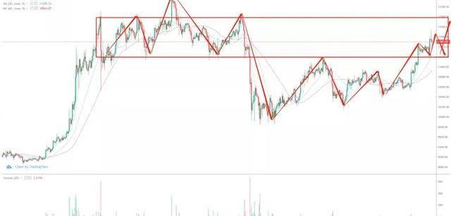 1900/1/1 0:00:00來看下目前的行情,周線級別可以看到昨晚的一波急漲下行情直接突破MA5和MA10的下行交叉點,最高運行到了11180附近,也就是突破了我們講的頸線位置,凌晨望淵在文章中講到了.