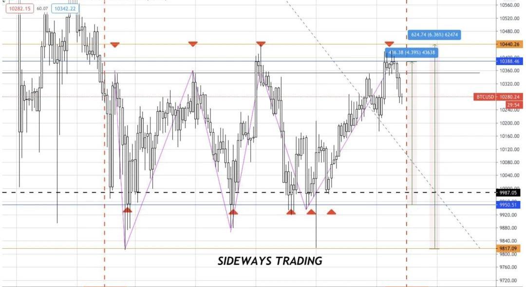 如果忽略最近的三角形形態,我們可以看到,在10400美元和10000美元之間反而出現了一段橫盤交易。