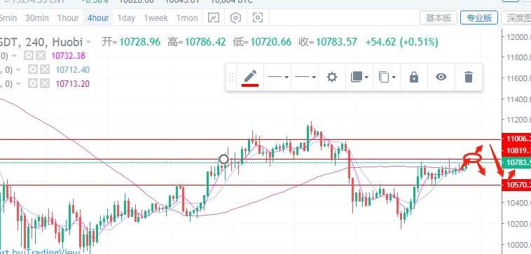 從目前的日線圖上來看,昨日日線再以倒錘頭收尾,接連兩個倒錘頭,都是在10800趨于承壓回撤的,說明上方壓力很大,行情表現出了見頂信號,今日需繼續關注10800趨于的破位情況,若還是不能突破,那么幣價大概率會因此再次走跌,不過在幣價跌破日線中軌10593一線之前,我們也不可過分去看跌,可繼續以區間震蕩調整來看待即可。