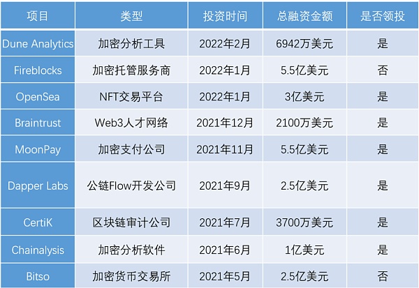 Coatue自2021年2月以來投資過 Flow 公鏈開發商 Dapper Labs、墨西哥加密交易所 Bitso、區塊鏈分析公司Chainalysis、Web3 工作平臺 Braintrust、NFT交易平臺Oopensea、區塊鏈審計公司CertiK、加密分析工具Dune Analytics等至少9個項目,并且大多以領投的身份參與。