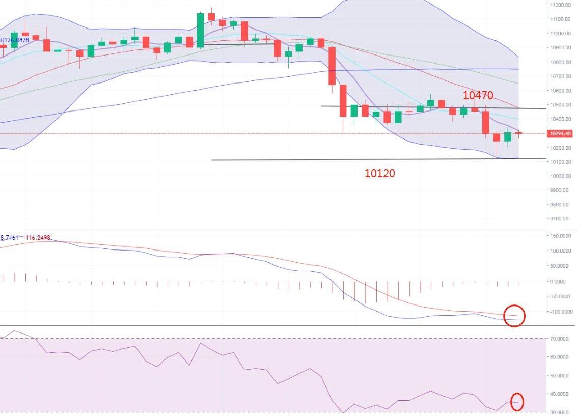 從技術層面上來說,四小時圖上來看,布林帶呈向下開口,K線連續三個周期收陰,價格來到五日均線和十日均線下方,上方壓制關注4小時布林帶中軌10470一線。附圖指標MACD一線呈開口向下運行,RSI一線動能不足呈水平運行,由此可見短期行情預計是一個震蕩姿態,但是目前局勢反轉,價格還有進一步下行的趨勢,程陽認為日內價會先有一個反彈上漲的過程,后續高位布局空單即可。
