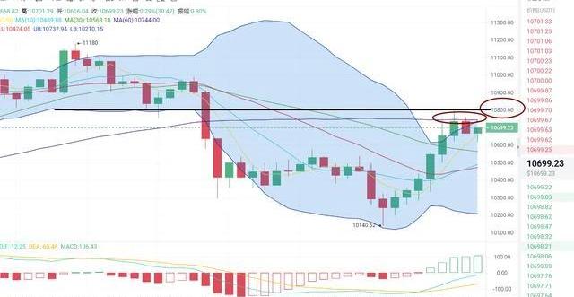 但是于早間6點鐘的時候,又開始拉升,最高觸及10794附近,日間盤整在10700附近