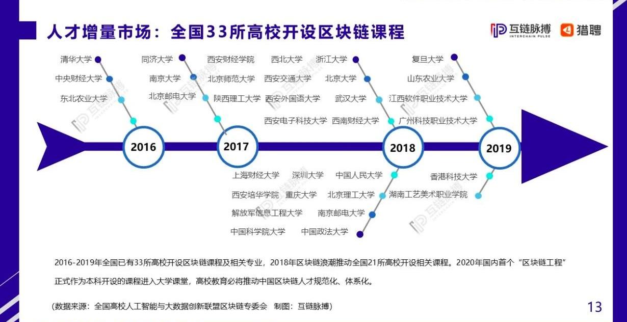 相比之下,我國高校區塊鏈人才培養雖然起步晚,但發展勢頭良好。據互鏈脈搏、獵聘聯合出品的《2020年中國區塊鏈人才發展研究報告》顯示,2016~2019年全國已有33所高校開設區塊鏈課程,包括清華大學、北京大學、浙江大學等。
