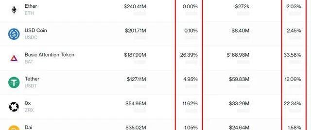 這幅圖羅列了Compound應用所支持的各類代幣的存貸利率。從圖中我們發現ETH和DAI的存貸利率都非常低,而這兩個代幣可以說是整個DeFi中的基石,它們幾乎占據了DeFi抵押市場的大部分份額。這兩個代幣的存貸利率如此低那只能說明整個DeFi目前對ETH和DAI的需求仍然非常有限,所以整個DeFi生態目前仍然不活躍。