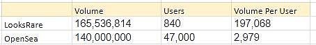 但是利益驅動之下,擼羊毛的人就多。從 Footprint 的數據看,過去 24h,LooksRare 人均交易金額 2.9 萬美金,而 OpenSea 人均交易金額僅 0.29 萬美金。這說明用戶為了獲得交易挖礦的獎勵,在重復的交易。