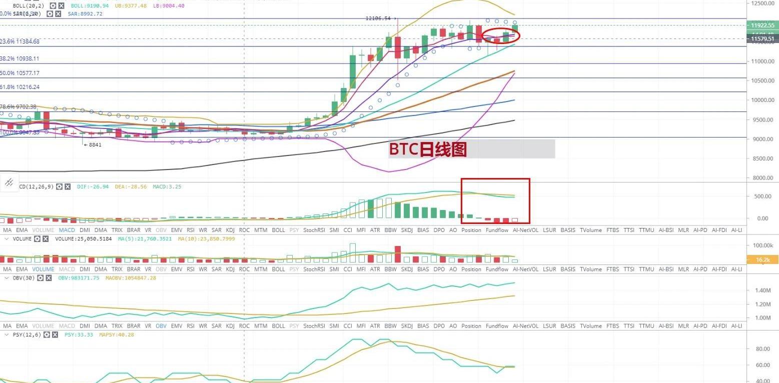 XRP/HKD-3.91%持幣者比特幣昨日早間幣價穩步抬升,日內高點達到11828一線,隨后幣價整體整體在11700一線附近高位震蕩,昨日日線圖上收取了一根陽線使得幣價繼續呈現震蕩走勢。