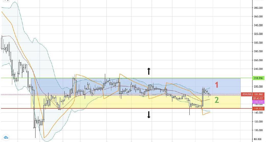 在這個區域內,分成了兩個區間:第一區間是180美元到220美元之間;第二區間是180美元到150美元。當BSV在這一交易區間內移動時,180美元既是支撐也是阻力。看來,至少在短期內,BSV將保持在第一區間。這是因為BSV位于BBs的上方區域,同時還有一個積極的SAR。如果BSV能夠維持在SAR上方的缺口,那么在不久的將來將達到220美元,當然BSV是否能夠突破這個交易區域又是另一個問題了。如果突破200美元,那么下一個目標是320美元。如果下行突破第二區間,那么BSV的下一個止損點將可能是105美元。