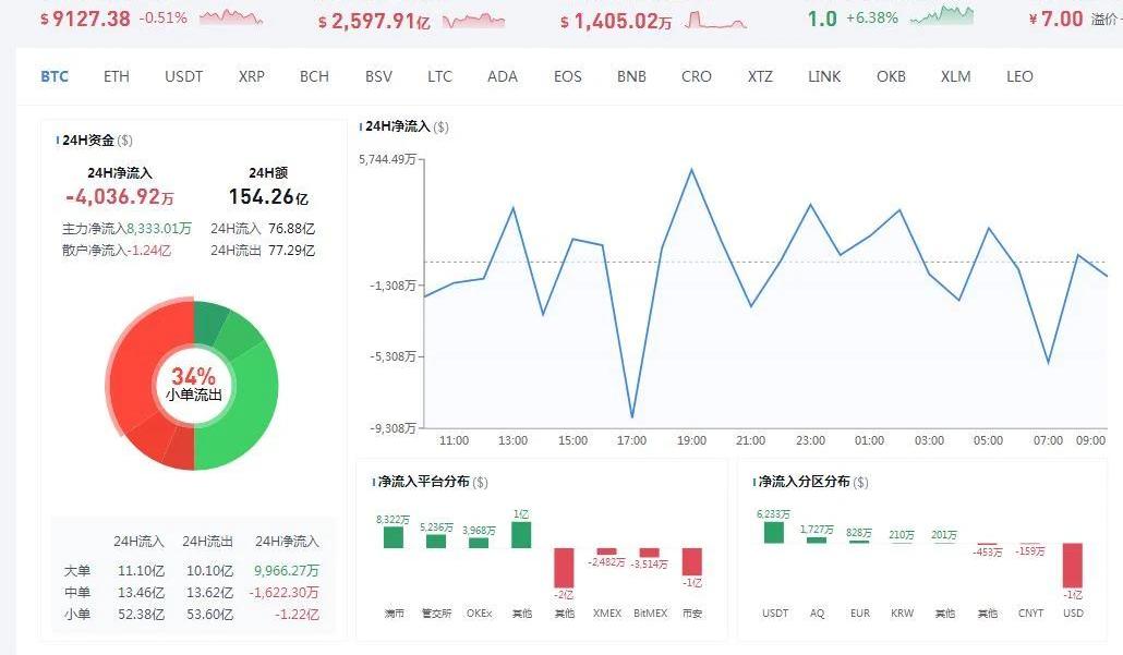 1900/1/1 0:00:00昨天到今天的9點,比特幣24小時凈流入2.59億美元,其中主力凈流入2.5億美元,散戶凈流入83.41億美元.
