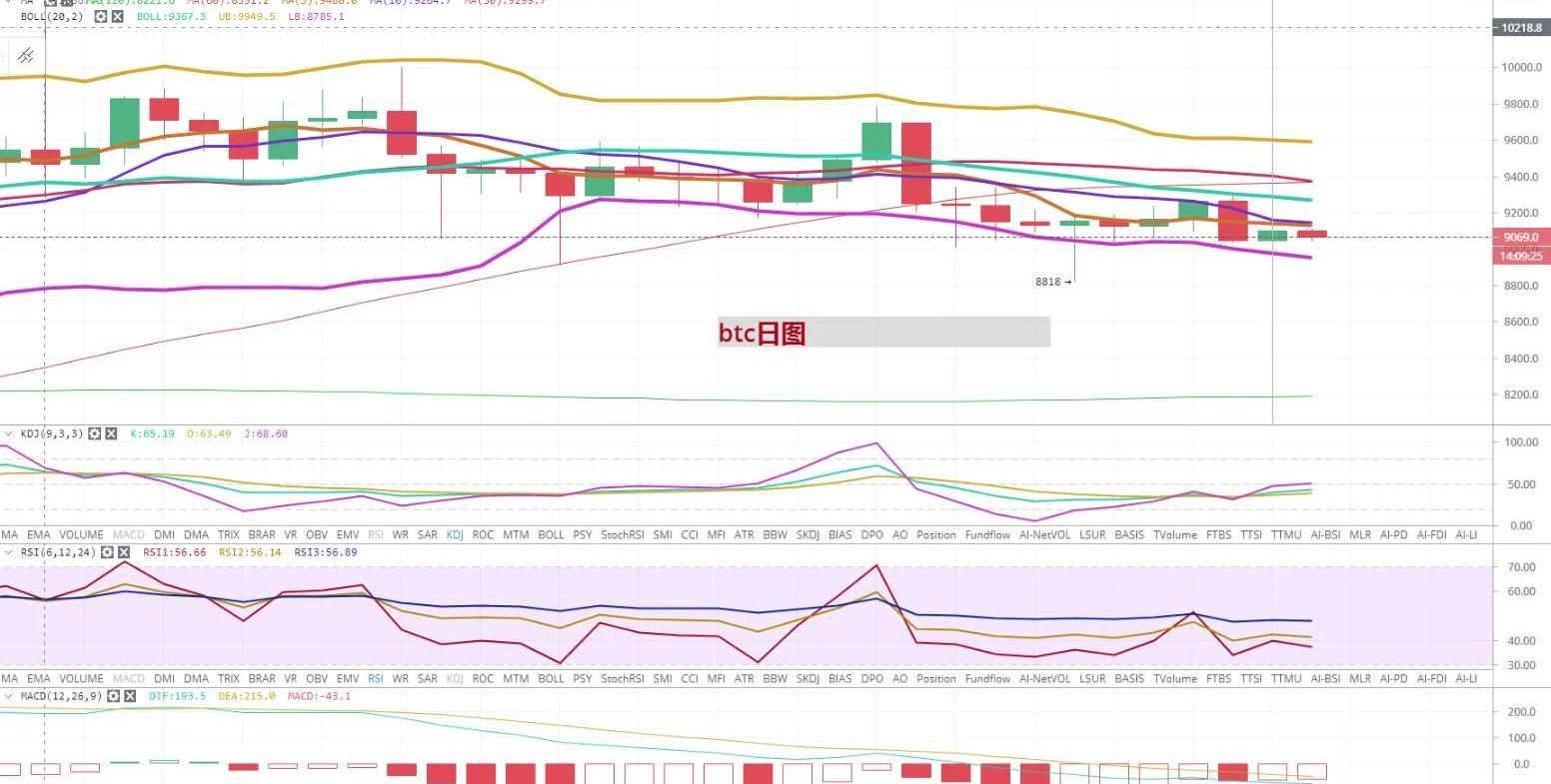 從4小時圖上看,經過昨天的小幅度反彈,今天從凌晨開始幣價在緩慢下行。目前均線系統中,MA5均線和MA10均線粘和,對幣價進行著壓制。在KDJ指標中,KJ線已經穿過D線,形成了金叉。在MACD中,空頭量能在逐步萎縮,就目前來看,持幣者認為,如果幣價有效的突破9100一線,行情還是向之前的那樣,布林通道下行,有下跌的可能。