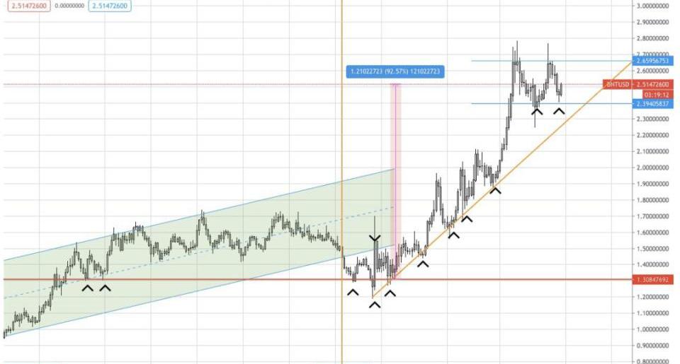 由于BNT令人難以置信的巨大漲幅,從這里開始,人們預期BNT將出現重大回調。然而出乎意料的是,BNT在1.3美元的水平找到了支撐。由此開始,BNT暴漲,從1.3美元漲到當前的2.5美元,漲幅92.5%。如下面的黑色箭頭所示,這一上漲走勢遵循的是一條趨勢線。