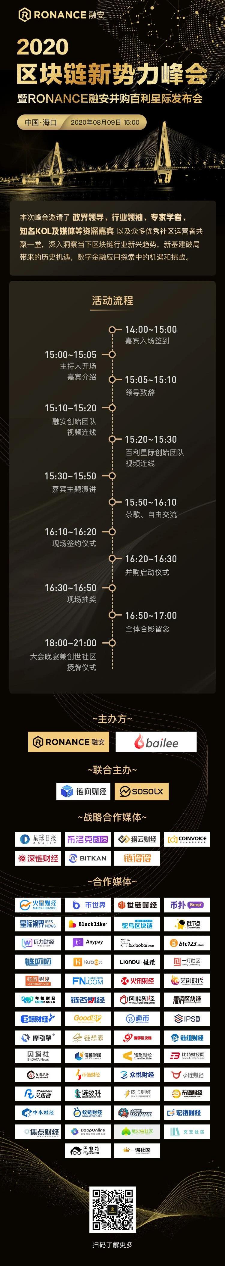 據悉,2020區塊鏈新勢力峰會-暨Ronance融安并購百利星際發布會將于2020年8月9日15:00在海口召開。本次大會融安國際攜手百利星際開啟市場新局面,共同創造未來的發展之道。