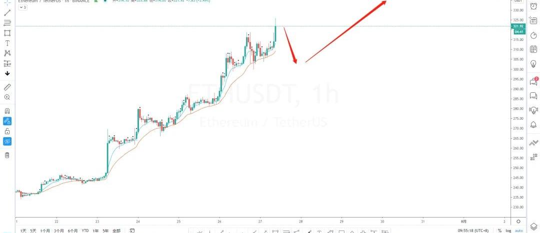 顯然價格來到大的震蕩區間上沿,這也是自6.7號以來首次反彈觸碰區間上沿