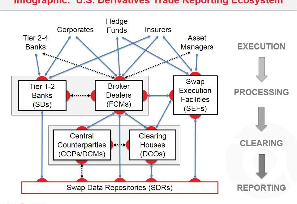 由于缺乏單一事實來源,給衍生品定價、計算對手方風險以及評估系統性風險就變成了難事。許多合約方由于誤判風險而最終破產,這一切都是因為它們很難獲得準確的市場數據。因此,許多衍生品交易商杠桿率過高,一個閃失就有可能導致其他市場發生多米諾骨牌效應。雖然在Dodd-Frank法案通過后,規定所有交易數據都必須上傳到全球數據庫,但如果交易元數據缺乏全球統一標準,那么仍然無法建立有效的監管機制,這對OTC市場來說尤為如此。