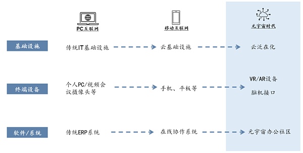 元宇宙時代,VR/AR、云計算、AI、區塊鏈等底層技術的發展將驅動辦公行業 生產力工具、溝通工具、協作工具全面進化。具體而言,1)VR/AR 技術的成熟一方面能夠帶給員工沉浸式的工作體驗,激發創造力,提升工作效率,另一方面,VR 會議比視頻會議更加貼近現實世界面對面的溝通效果,能顯著提升溝通效率;2)云計算/邊緣計算等網絡基礎設施的發展提升了信息傳輸的速率及質量,實現異地溝通的高實時性及高互動性,促進協作辦公范圍進一步擴大;3)AI 等人工智能技術融入具體辦公場景,使得辦公智能化程度進一步提升;4)同時,區塊鏈技術作為數字世界的信任基礎,有望解決元宇宙時代數據安全及個人隱私保護等問題。
