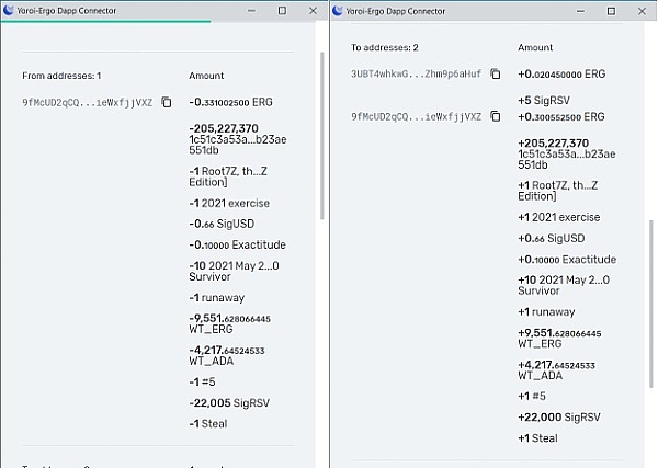 在上圖的左側部分,您將看到大約228枚ERG被取走,而在右側部分,您將看到31枚ERG被發送和197枚ERG重新存入您的錢包。