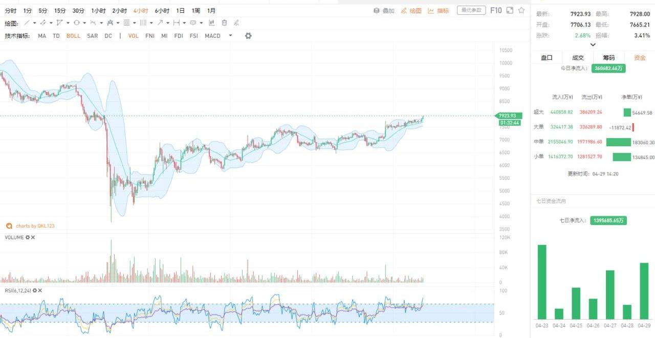 橫盤多日之后,BTC今日迎來變盤向上,資金流較昨日流入明顯增加,短時上探8000美元重要關口。8000美元為200日均線位置,通常可以作為長期牛熊的分界線,后續若能走出,長期趨勢看好,但恐受金融大環境影響,短期回落風險依然存在。
