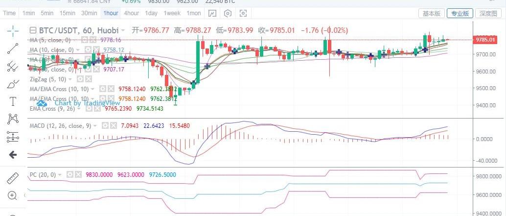 昨日早間一波天地針插完以后,大餅就進入了萎靡狀態,持續震蕩了一天,上下振幅不超過100個點。直到凌晨3點,大餅終于是從9650一線漲至9800。隨后回調到9750上開始震蕩運行。