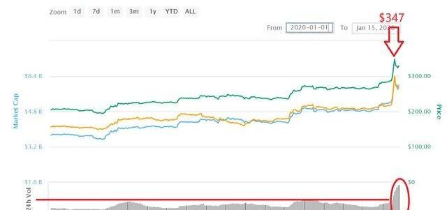 上圖是這次爆漲的領頭羊BSV的價格走勢圖。從圖中可以看到BSV直接暴力地拉出了一根大陽線,從14日爆漲前的172美元猛漲至331美元,漲幅達92%。而對應此次價格的爆漲,成交量也迎來巨量,可以看到這次短短一天的成交量幾乎是平日成交量的三到四倍。