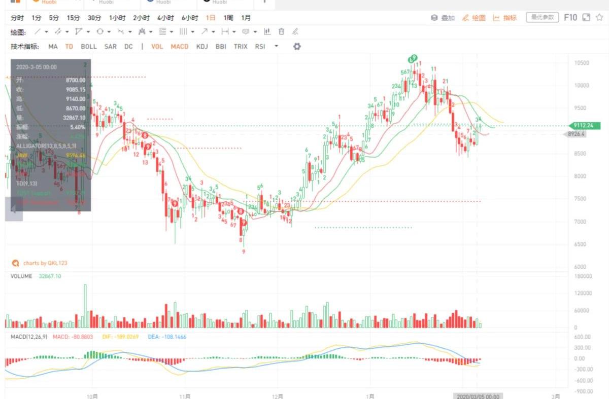BTC日線上呈縮量上行,目前站上了9000美元,短時多軍開始掌控市場節奏。MACD在零線下方臨近金叉,鱷魚指標張口向上收窄,TD指標顯示依然有上行空間,市場這是要上探9600美元壓力位的節奏。