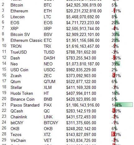今日市值前100的幣種中,幾乎所有幣種都出現了上漲,其中BSV漲幅近10%,是主流幣中漲幅最高的,BCH和LTC也有較大的漲幅,漲幅約5%。沒有太多幣種出現下跌,且均為小幣種。