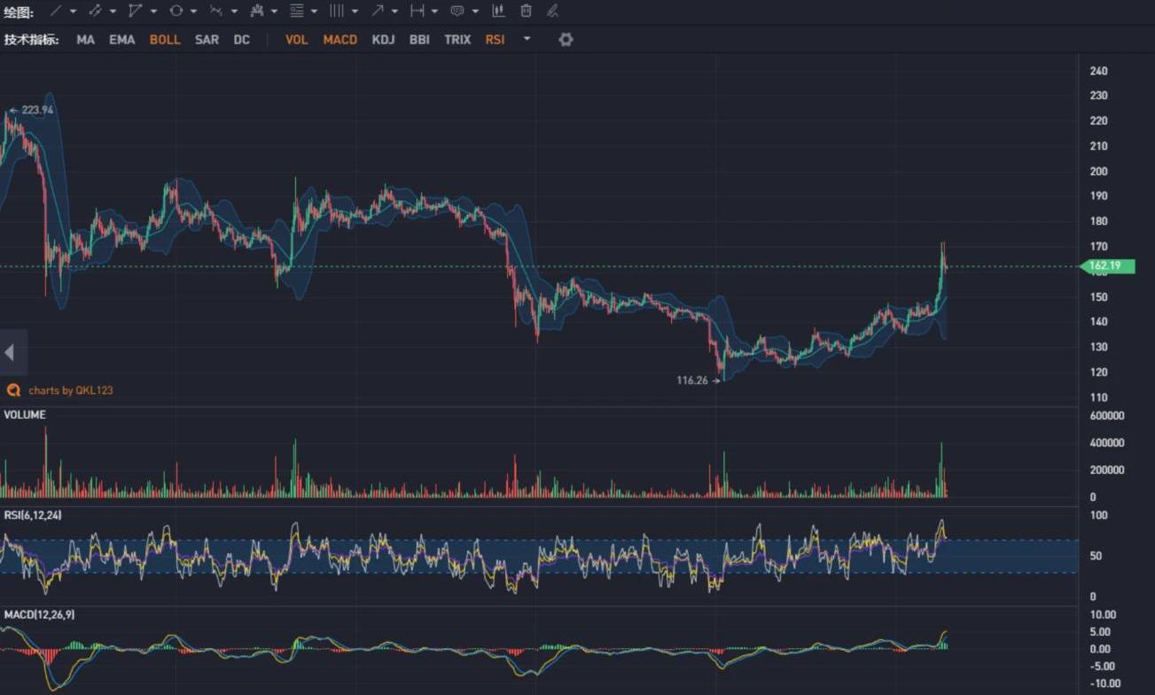ETH從昨日的140美元附近快速上行,最高觸及171美元,放量后突破前日高點,目前站上160美元,短時回踩確認。