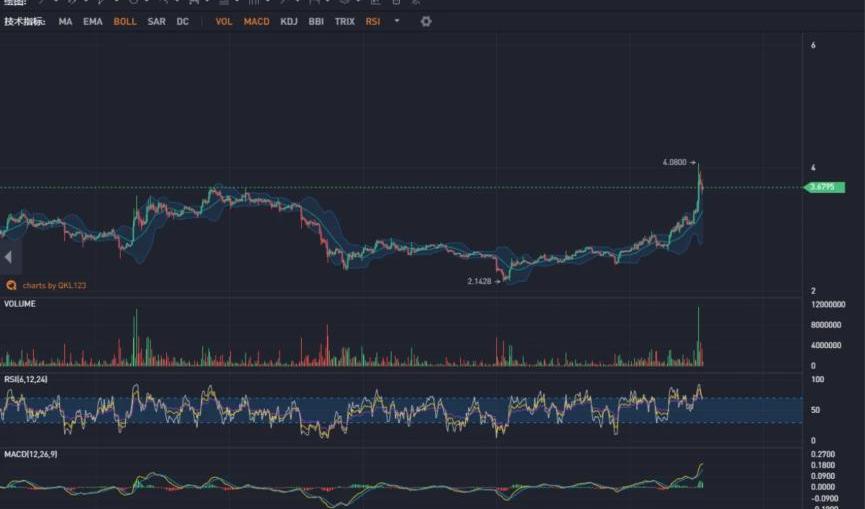 EOS相對表現繼續強勢,從昨日3.3美元最高拉升至4.0美元附近,釋放的量能較為明顯,短時被空軍壓制,回踩3.6美元。