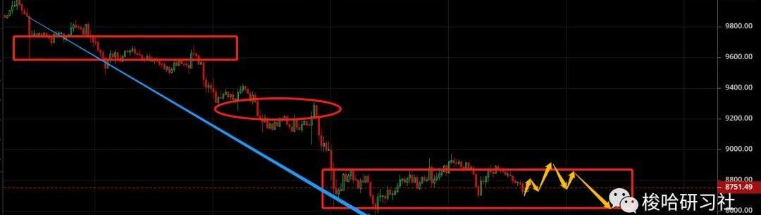 BTC在下跌到8500附近有出現企穩,從盤面看,很明顯有一波引導性的資金介入,但是整體的走勢還是屬于下跌的趨勢,也就是說明他這波的盤整只是在下跌趨勢中的第一個走勢的結構而已。從目前來看的話,反轉的可能性很小。這個箱體走完后,大概率還是會再繼續往下看的。但是在結合整個大周期來看,目前在8500多這個位置的多頭的抵抗并不是很強。也就是說,雖然短線止跌,但是反轉的概率非常小。所以建議投資者穩健派可以等8500附近企穩再進行多單的操作,不然還是盡量反彈做空為主。