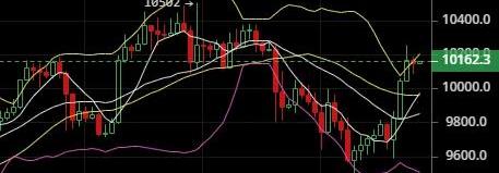 BTC走勢稍有反彈趨勢,今日再次站上一萬關口,四小時級別圖中,布林帶開口,行情從布林帶的下軌邊緣,逐漸向布林帶的中軌以及上軌展開攻勢,現已成功的回到了上軌附近運行,MA5和MA10均線整體情況不變,MA60均線在行情下方形成底部,如后期行情有所轉變那么底部的重要性也將慢慢凸顯,今日上至10250遇壓力短暫性的回調,現在可以說站穩10100一個關鍵性的點位,下方跌不破10100—10050一線的話,今日的上漲還是還是有望的。不破的話,繼續下探9800一線形成震蕩。