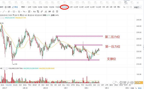 柚子小周期跟隨大餅就行反彈,短線以聯動大餅為主。30分鐘形成了向上的收斂三角,可注意K線何時突破上軌或下軌,會有一段突破行情。壓力位3.65美元,支撐位3.40美元。