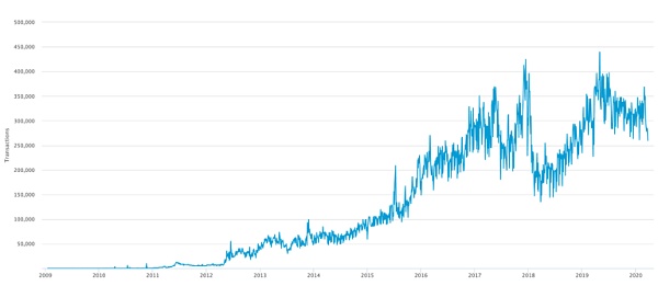 自2020年年初以來,比特幣每日交易數量已從29500筆上升至最近的340000筆。