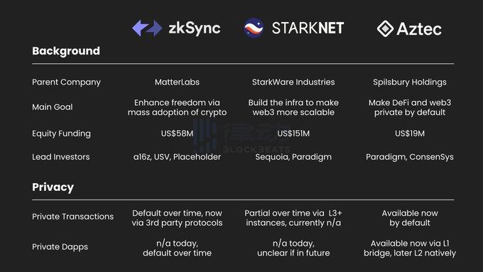 讓我們來看一下在默認隱私保護的狀態下,基于 zkRollups 方案的 zkSync、StarkNet 和 Aztec 在以太坊主網的對比情況。
