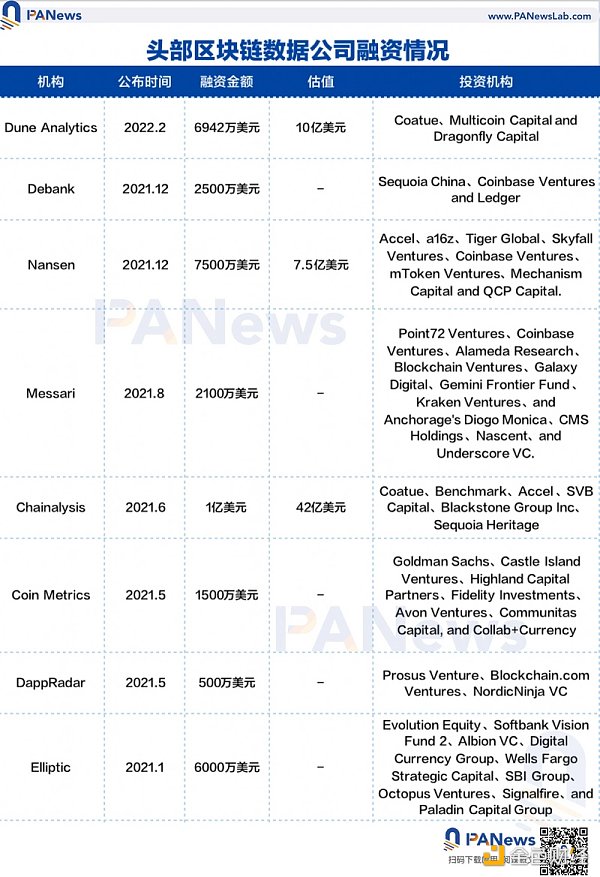 相比加密圈原生的投資機構,有不少傳統的投資機構在這一賽道多重下注,例如,Coatue領投了Chainalysis的E輪和Dune Analytics的B輪,Tiger Global領投了The Graph,同時也參投了Nansen最新一輪的融資,Accel在Nansen這一輪中領投,同時在Chainalysis去年6月的一輪融資中跟投。